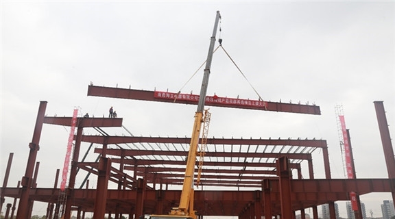 At the word of command at 10:18 am, the beam raising ceremony was launched on time. A roofing beam weighing 6 tons in main building was steadily lifted and connected accurately with the steel columns on both sides.