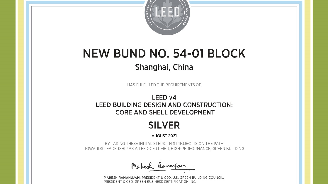 The technical team of consulting company got involved in the project pre-construction development and planning and design phases to provide technical requirements as per the status of the project design owing to the advantages in LEED certification services for years and based on goals of certification and the principle of minimum cost increments. As a professional consulting service team, the "Qiantan 54-01 Plot" project team of the consulting company provided the Owner with professional and reliable opinions on drawing approval at different approval nodes to ensure the practicality of green technologies in terms of sustainable site identification, water efficiency, energy utilization, material resources and indoor environmental quality, as well as presented the application materials in accordance with the requirements of LEED certification and actively communicated with the US GBCI audit team to finally have the LEED silver pre-certification certificate awarded, which was unanimously recognized by the Owner.