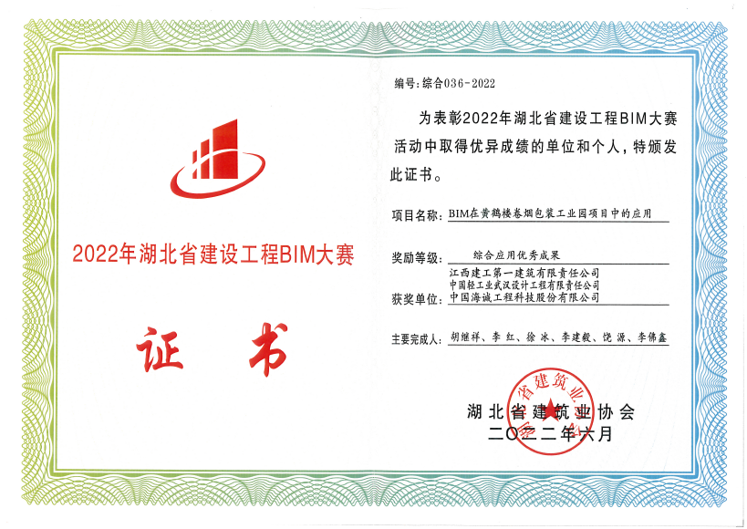 Recently, the Hubei Association of Construction Industry announced the results of the 2022 Hubei Provincial Construction Engineering Competition, in which the "Technical Application of BIM in the Huanghelou Cigarette Packaging Industrial Park Project" led by CLWD of China Haisum won the Award for Outstanding Achievements of Comprehensive Category.