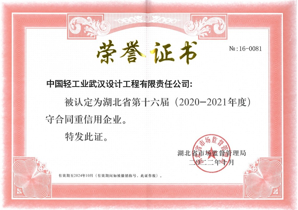 Recently, in the 16th (2020-2021) "Contract Abiding and Trustworthy" enterprise selection in Hubei Province, China Light Industry Wuhan Design & Engineering Co., Ltd. won the honorary title of "Contract Abiding and Trustworthy" enterprise once again.