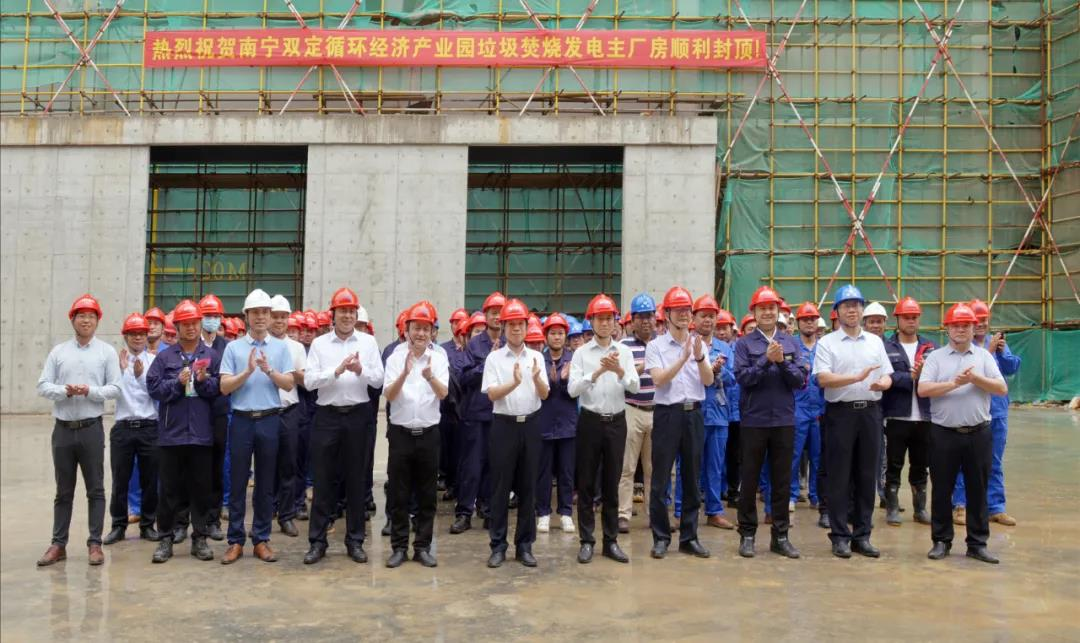 南寧市雙定循環(huán)經(jīng)濟產(chǎn)業(yè)園項目位于南寧市西鄉(xiāng)塘區(qū)雙定鎮(zhèn)華潤水泥廠西側(cè),是南寧市第一個以“一園多區(qū)、集約協(xié)同、智慧運管、綠色循環(huán)”為建園理念的循環(huán)經(jīng)濟產(chǎn)業(yè)園,園區(qū)占地面積約1100畝,總投資約23.52億元。建設(shè)規(guī)模劃分為三大板塊。此次封頂?shù)纳罾鍧嵎贌l(fā)電廠總處理規(guī)模 3000t/d,土建一次建成,設(shè)備分期安裝。垃圾焚燒發(fā)電廠項目完成后預(yù)計年發(fā)電量約2.85億度,年上網(wǎng)電量約2.15億度。