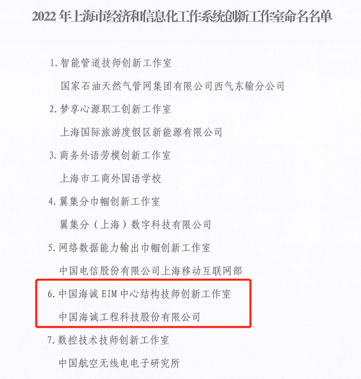 7月12日,上海市經(jīng)濟和信息化工作系統(tǒng)工會工作委員會正式發(fā)布了《關(guān)于命名2022年海市經(jīng)濟和信息化工作系統(tǒng)創(chuàng)新工作室的決定》,市經(jīng)信系統(tǒng)工會授予“中國海誠EIM數(shù)創(chuàng)中心結(jié)構(gòu)技師創(chuàng)新工作室”。