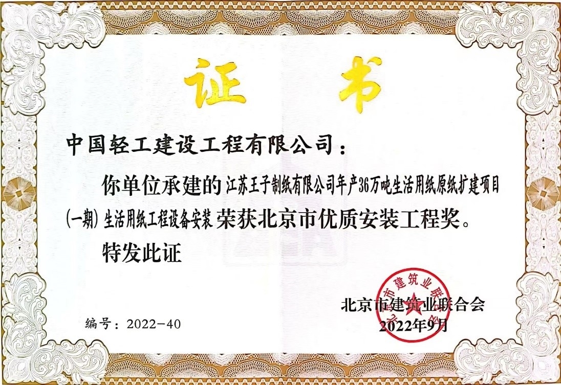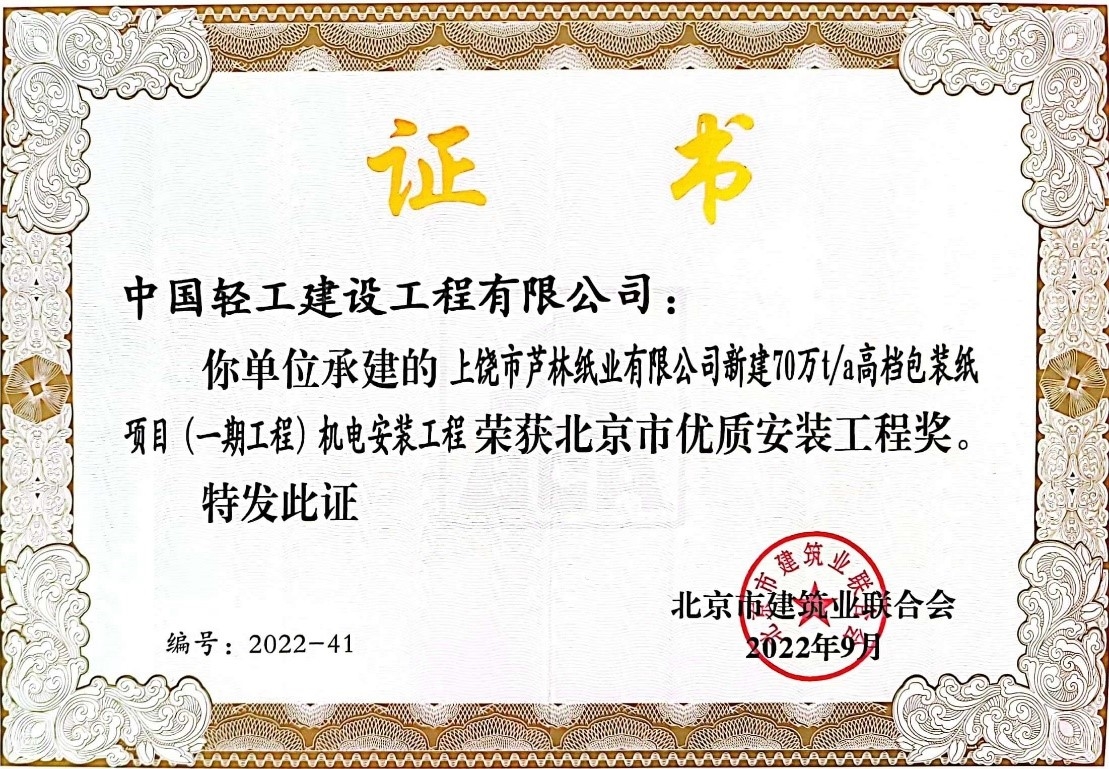 近期,北京市建筑業(yè)聯(lián)合會(huì)發(fā)布“關(guān)于公布2022-2023年度(第一批)北京市優(yōu)質(zhì)安裝工程獎(jiǎng)評(píng)選結(jié)果的通知”(京建聯(lián)[2022]71號(hào)),中國(guó)海誠(chéng)中輕建設(shè)承建的“上饒市蘆林紙業(yè)有限公司新建70萬(wàn)t/a高檔包裝紙項(xiàng)目(一期工程)機(jī)電安裝工程”和“江蘇王子制紙有限公司年產(chǎn)36萬(wàn)噸生活用紙?jiān)垟U(kuò)建項(xiàng)目(一期)生活用紙工程”榮獲北京市優(yōu)質(zhì)安裝工程獎(jiǎng)。