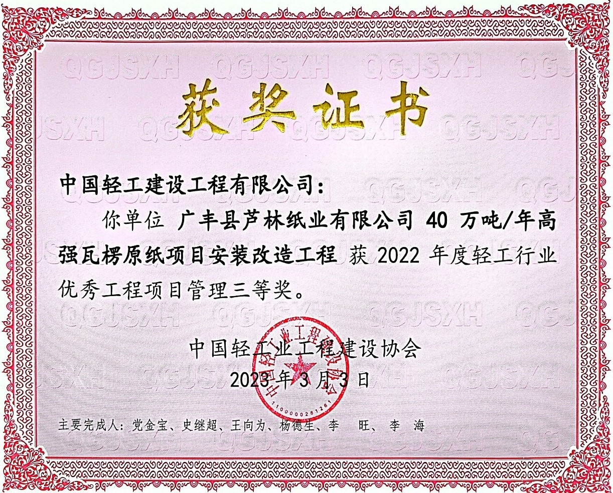 近期,中國(guó)輕工業(yè)工程建設(shè)協(xié)會(huì)發(fā)布“2022年度輕工行業(yè)優(yōu)秀項(xiàng)目管理和工程總承包評(píng)價(jià)結(jié)果公告”(中輕建協(xié)[2023] 10號(hào)),中國(guó)海誠(chéng)所屬中國(guó)輕工建設(shè)工程有限公司(以下簡(jiǎn)稱(chēng)中輕建設(shè))承建的“廣豐縣蘆林紙業(yè)有限公司40萬(wàn)噸/年高強(qiáng)瓦楞原紙項(xiàng)目安裝改造工程”經(jīng)評(píng)審專(zhuān)家的嚴(yán)格評(píng)審,在眾多參選項(xiàng)目中脫穎而出,榮獲三等獎(jiǎng)。