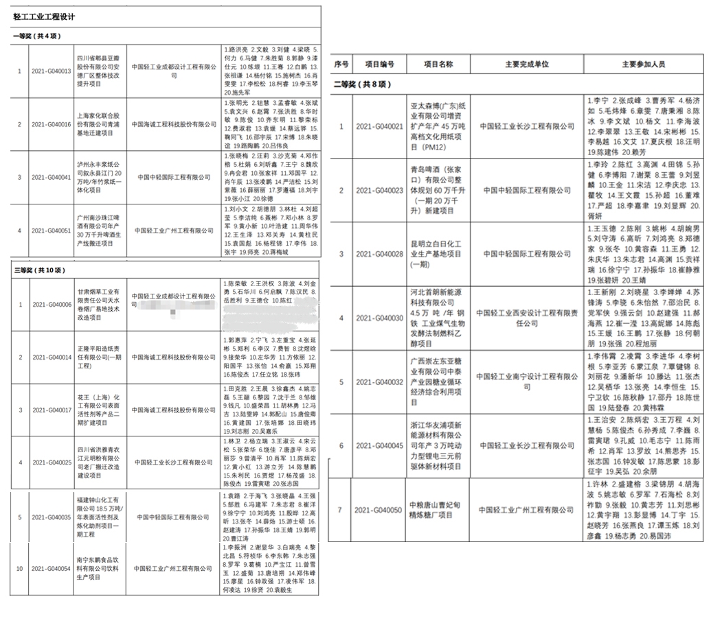 近期,中國(guó)勘察設(shè)計(jì)協(xié)會(huì)公布2021年度工程勘察、建筑設(shè)計(jì)行業(yè)和市用公用工程優(yōu)秀勘察設(shè)計(jì)獎(jiǎng),在輕工業(yè)工程設(shè)計(jì)一欄(共22個(gè)獎(jiǎng)項(xiàng)),中國(guó)海誠(chéng)及所屬單位作為項(xiàng)目主要完成單位包攬一等獎(jiǎng)4項(xiàng)、二等獎(jiǎng)7項(xiàng)、三等獎(jiǎng)6項(xiàng)。