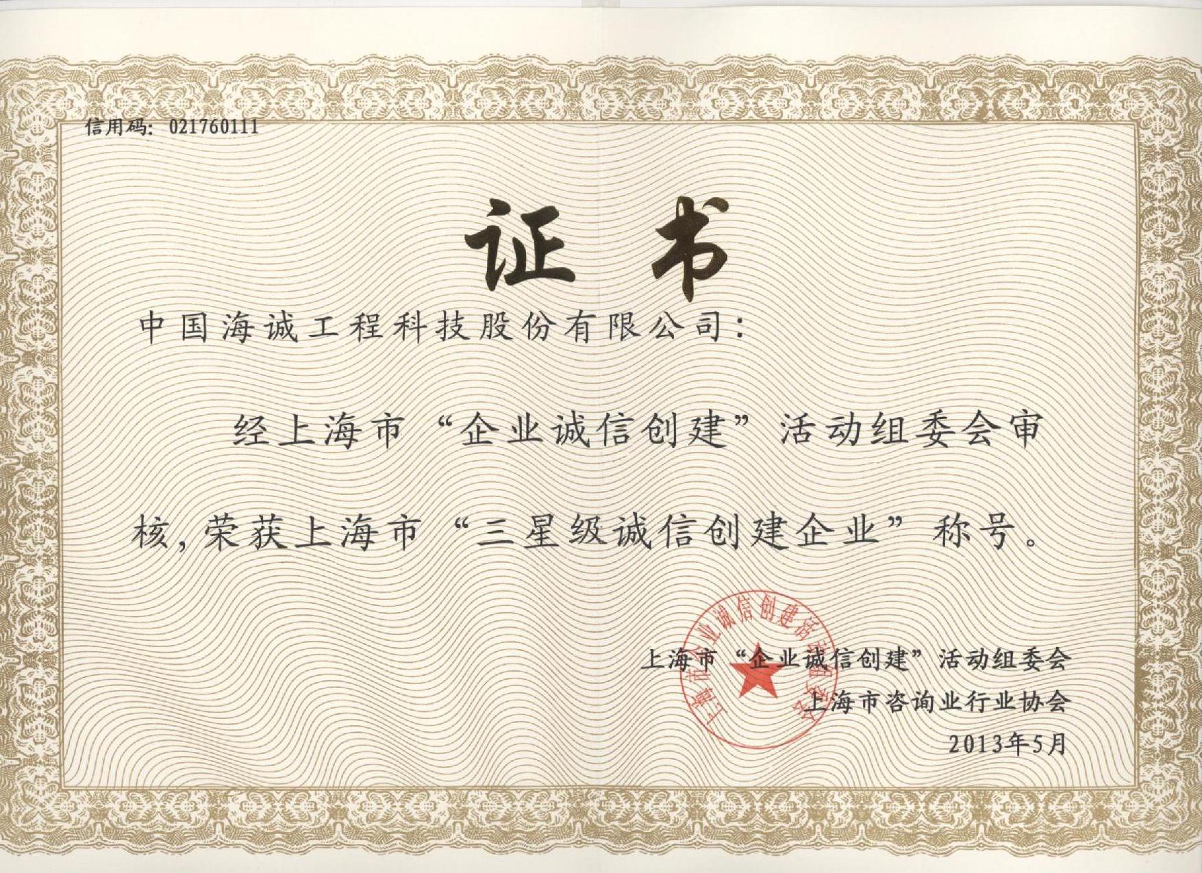 近日,在上海市“企業(yè)誠信創(chuàng)建”活動組委會和上海市咨詢行業(yè)協(xié)會的評選活動中,我公司被評為上海市“星級誠信創(chuàng)建企業(yè)”(2012-2013年度)三星級。