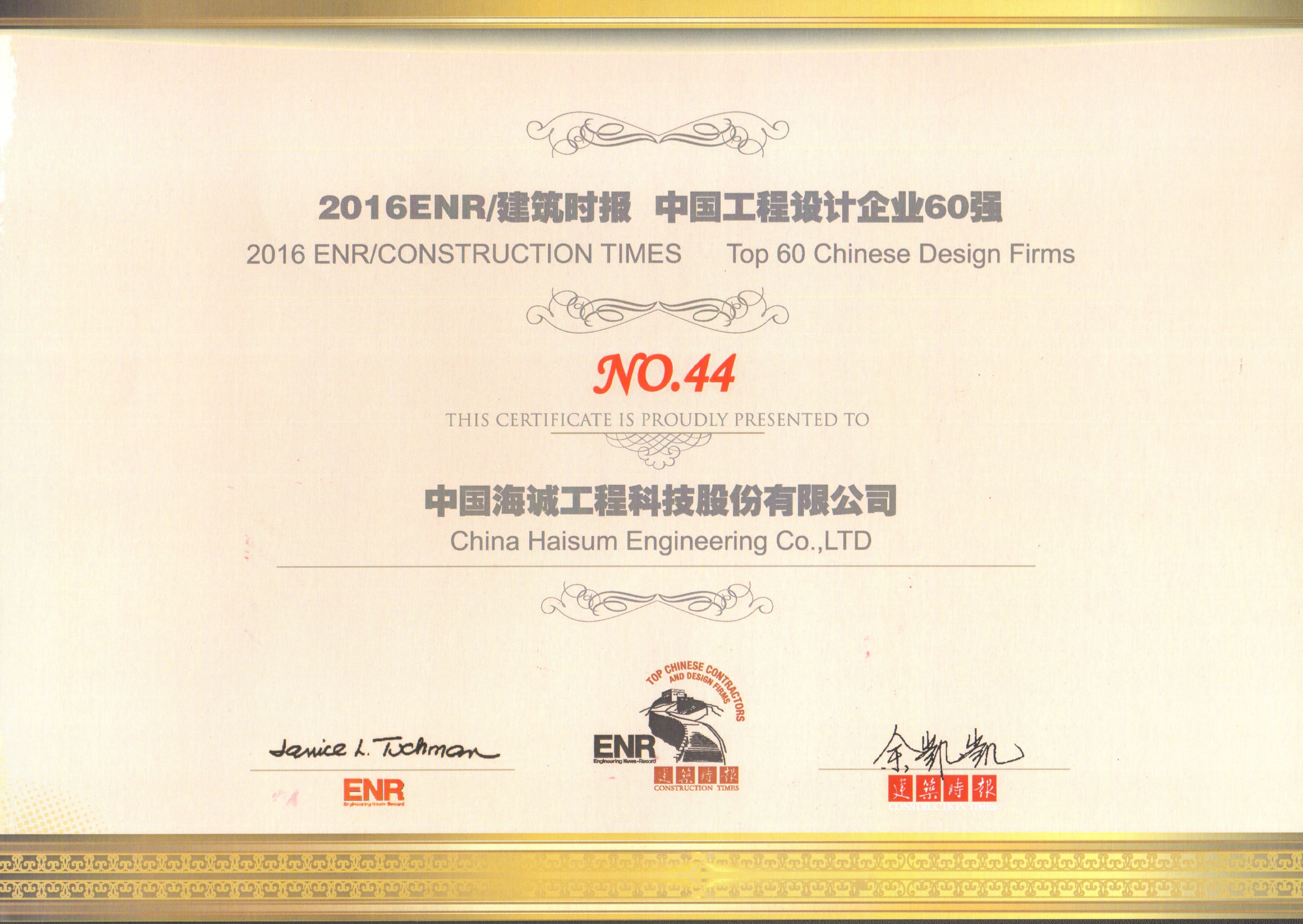 2016年ENR/《建筑時(shí)報(bào)》“中國(guó)承包商80強(qiáng)和工程設(shè)計(jì)企業(yè)60強(qiáng)”頒獎(jiǎng)典禮于2016年11月24日-25日在福州隆重舉行。海誠(chéng)股份以設(shè)計(jì)營(yíng)業(yè)收入103931.84萬元位列中國(guó)工程設(shè)計(jì)企業(yè)60強(qiáng)第44位。