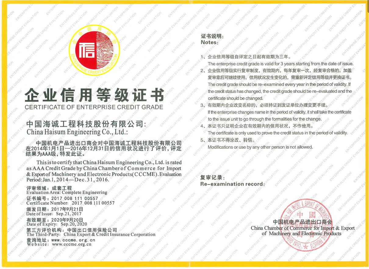 中國機(jī)電產(chǎn)品進(jìn)出口商會(huì)由國資委批準(zhǔn)成立,是全國首批信用評價(jià)試點(diǎn)單位,是我國從事機(jī)電產(chǎn)品進(jìn)出口貿(mào)易相關(guān)活動(dòng)的全國性行業(yè)組織。中國海誠股份自參加成套工程領(lǐng)域信用評價(jià)以來,連續(xù)獲得成套工程領(lǐng)域AAA級(jí)信用企業(yè)稱號(hào)。
