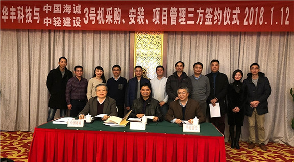 1月12日,浙江華豐紙業(yè)科技有限公司年產6.5萬噸卷煙產品配套用紙生產線項目3號機工程紙機專用設備采購、安裝、項目管理三方簽約儀式在浙江安吉舉行。海誠股份黨委書記、總裁徐大同、華豐集團董事長王海佩、中輕建設董事長余鼎榮出席了簽約儀式并代表三方公司簽約。