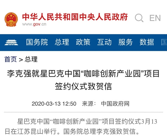 2020年3月13日,星巴克中國“咖啡創(chuàng)新產(chǎn)業(yè)園”項(xiàng)目簽約儀式在江蘇昆山舉行。國務(wù)院總理李克強(qiáng)致賀信。