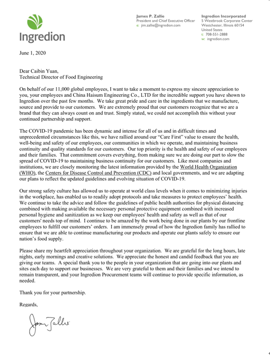 日前,海誠股份食品總監(jiān)袁蔡斌收到一封來自美國宜瑞安集團(tuán)(Inredion Incorporated)首席執(zhí)行官詹姆斯•扎利(James Zallie)先生的感謝信,信中對公司的宜瑞安五星項(xiàng)目設(shè)計團(tuán)隊以及項(xiàng)目經(jīng)理黃萍,在新冠疫情期間為項(xiàng)目順利進(jìn)行所付出的辛勤工作表示感謝。