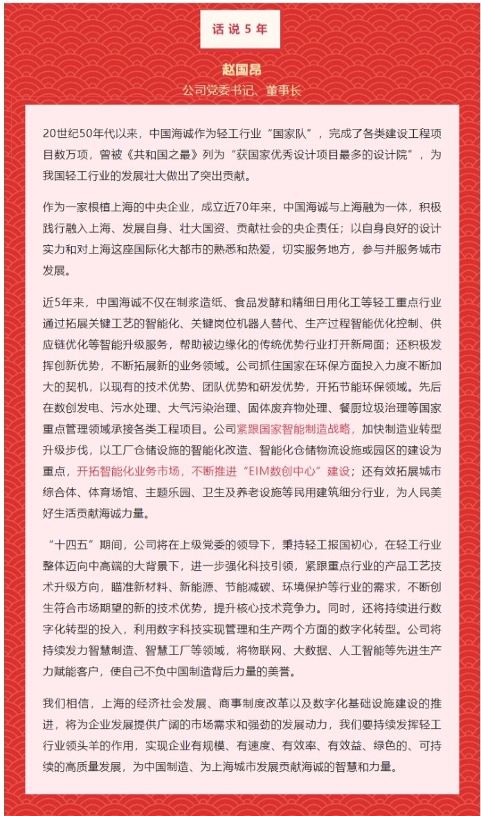 近年來(lái),中國(guó)海誠(chéng)積極倡導(dǎo)產(chǎn)學(xué)研合作,開(kāi)展技術(shù)創(chuàng)新。產(chǎn)學(xué)研合作成果已在多個(gè)項(xiàng)目的成套設(shè)備和工程體系中運(yùn)用,加速了中國(guó)海誠(chéng)科技能力的提升,也加快了市場(chǎng)開(kāi)拓的步伐。“作為從事輕工行業(yè)專(zhuān)業(yè)服務(wù)的在滬央企,中國(guó)海誠(chéng)將繼續(xù)堅(jiān)持在黨的領(lǐng)導(dǎo)下,肩負(fù)起全新的歷史使命,把握國(guó)際國(guó)內(nèi)發(fā)展大勢(shì),立足公司現(xiàn)實(shí),用組織變革、技術(shù)提升和數(shù)字化轉(zhuǎn)型跨越鴻溝,用創(chuàng)新進(jìn)取、服務(wù)客戶(hù)、精益管理、優(yōu)秀執(zhí)行來(lái)應(yīng)對(duì)不確定性,通過(guò)數(shù)字化轉(zhuǎn)型,站在更廣義的產(chǎn)業(yè)鏈上,再定位、再出發(fā),用數(shù)字技術(shù)和集成創(chuàng)新點(diǎn)亮海誠(chéng)未來(lái),以?xún)?yōu)異的成績(jī)向黨的二十大獻(xiàn)禮!”中國(guó)海誠(chéng)黨委書(shū)記、董事長(zhǎng)趙國(guó)昂說(shuō)。