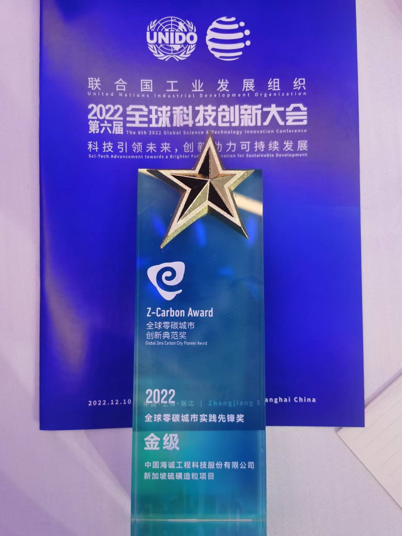 2022年12月10日,2022第六屆聯(lián)合國工業(yè)發(fā)展組織全球科技創(chuàng)新大會在上海成功舉辦。會上,中國海誠獲“全球零碳城市創(chuàng)新典范獎”殊榮,由中國海誠總承包的“新加坡硫磺造粒項目”榮獲“2022全球零碳城市實踐先鋒獎金級”。