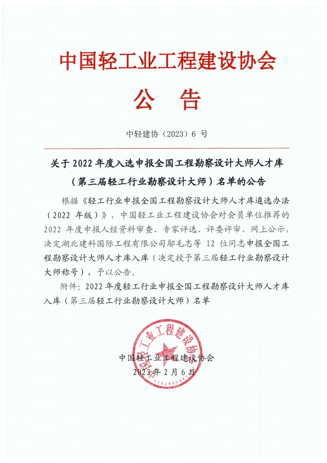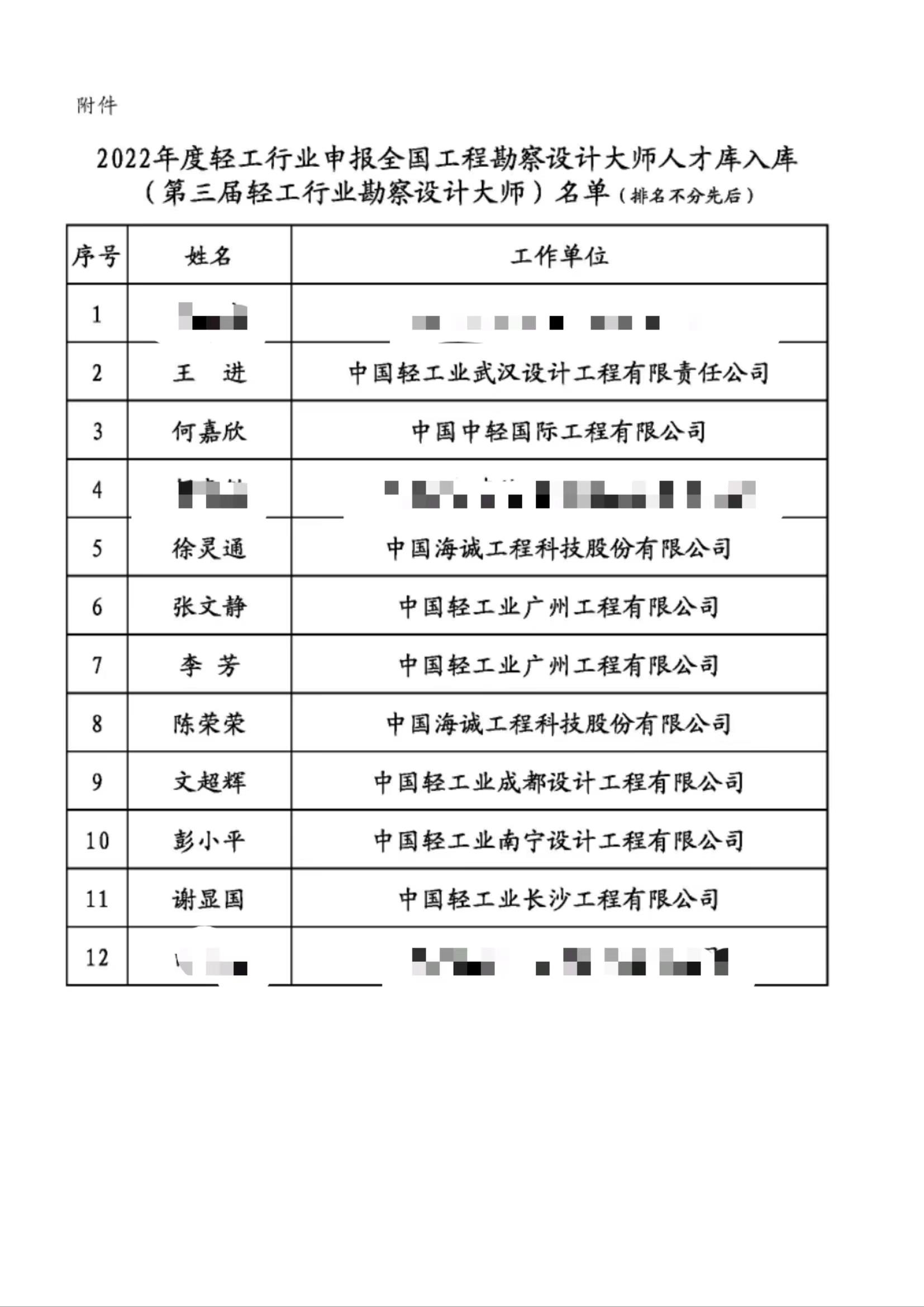 近日,中國(guó)輕工業(yè)工程建設(shè)協(xié)會(huì)發(fā)布“關(guān)于2022年度入選申報(bào)全國(guó)工程勘察設(shè)計(jì)大師人才庫(kù)(第三屆輕工行業(yè)勘察設(shè)計(jì)大師)名單的公告”, 12位全國(guó)輕工行業(yè)勘察設(shè)計(jì)大師名單中,中國(guó)海誠(chéng)及所屬單位入選9位。