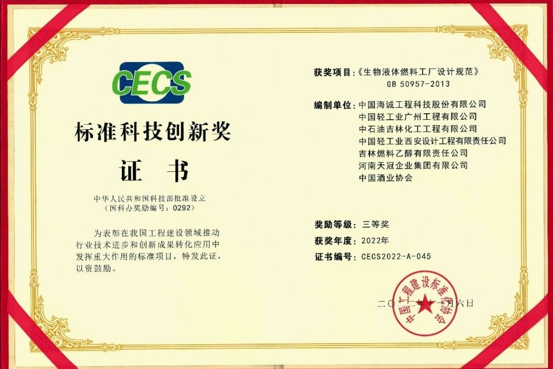 近期,2022年度標準科技創(chuàng)新獎頒獎典禮大會在京隆重舉行。經(jīng)過各方推薦申報、形式審查、專家初評、項目現(xiàn)場答辯、評審委員會投票和最終審定、結(jié)果公示等程序,中國海誠主編的《生物液體燃料工廠設(shè)計規(guī)范》(GB 50957-2013),榮獲“標準科技創(chuàng)新獎”項目獎三等獎。