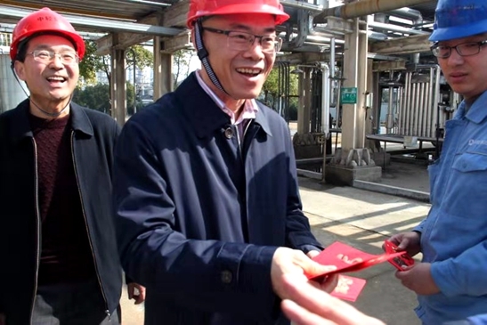 張萬順深入中控室、配電室、生產(chǎn)車間、環(huán)氧卸車平臺(tái)、污水處理站。每到一處,他都與員工一一親切握手,“同志們辛苦了”,“給大家拜年了”,一聲聲問候,一句句祝福,溫暖了堅(jiān)守一線的每一位員工。