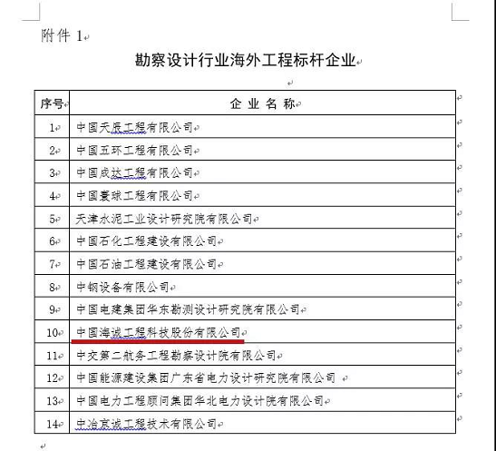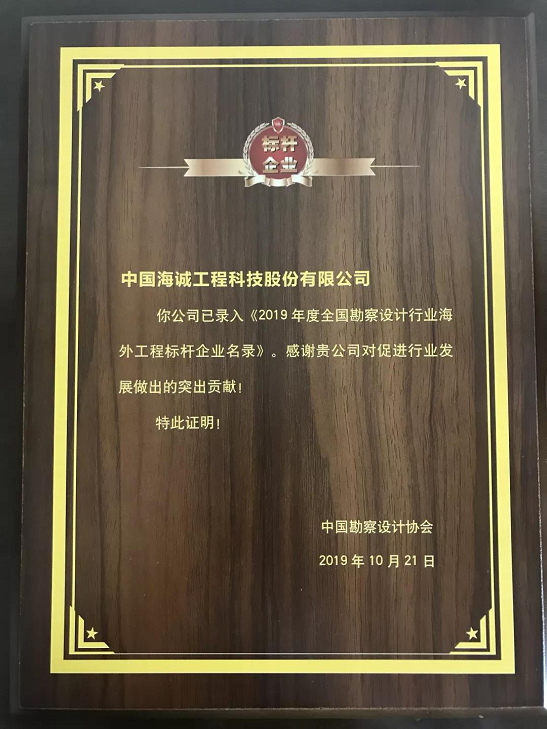 10月21日,中國(guó)勘察設(shè)計(jì)協(xié)會(huì)公布了“海外工程標(biāo)桿企業(yè)”評(píng)選結(jié)果,中輕集團(tuán)海誠(chéng)股份入選《2019年度全國(guó)勘察設(shè)計(jì)行業(yè)海外工程標(biāo)桿企業(yè)名錄》,成為海外工程標(biāo)桿企業(yè)。