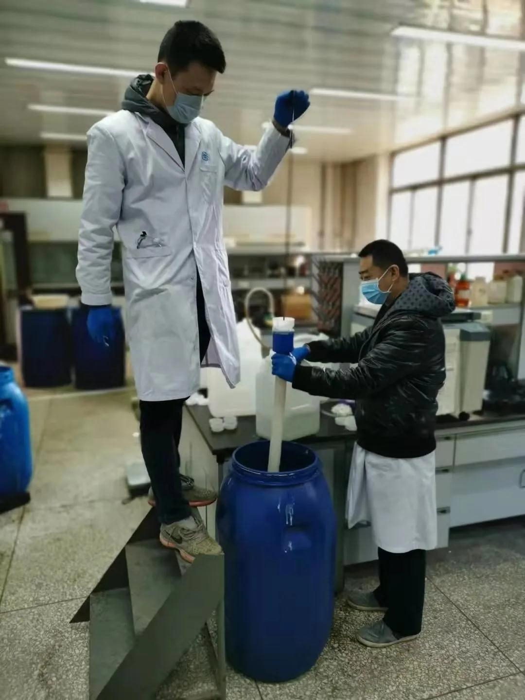 要為抗擊疫情貢獻力量!白艷云趕緊出門,但公共交通已經(jīng)停運。怎么辦?騎車!從家里騎到實驗室,白艷云騎行了40分鐘。顧不得雙腿的酸痛,白艷云和同事們開始投入到消毒劑原液的配置中。為了加快配置進度,大家合力抬起近百公斤重的原料桶,進行分裝調(diào)制。
