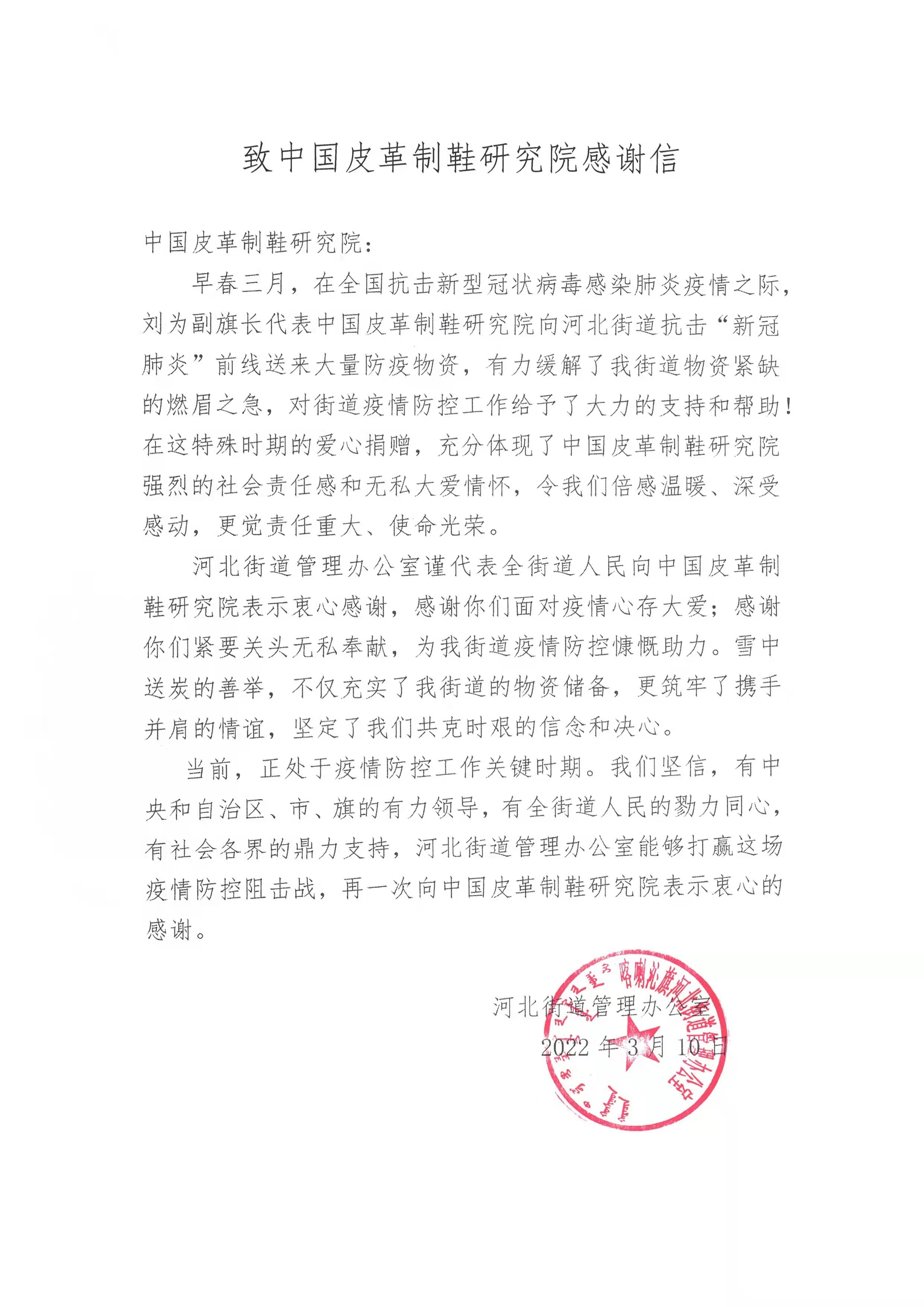為助力內蒙古喀喇沁旗渡過疫情難關,中國皮革制鞋研究院向喀喇沁旗河北街道捐贈了400套防護服,并收到河北街道發(fā)來的感謝信。