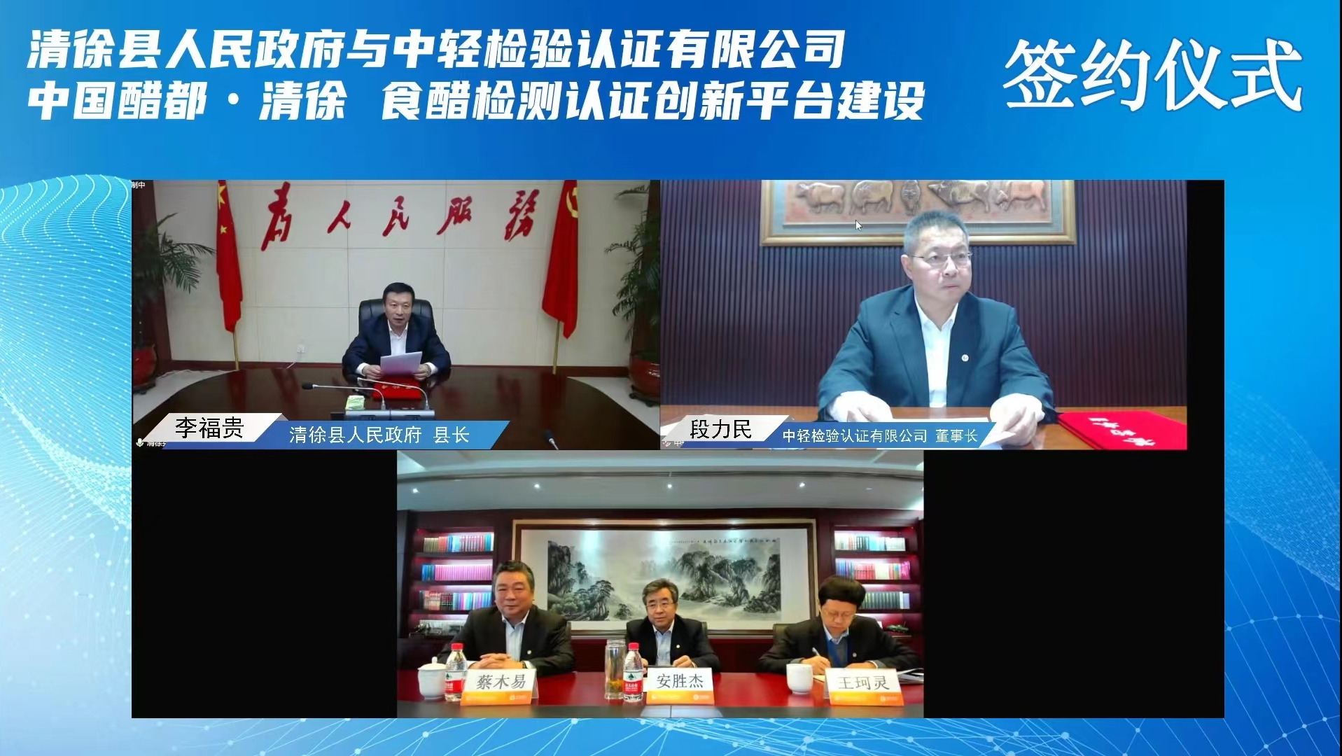 為進一步落實習近平總書記在黨的二十大報告中提出的“必須堅持科技是第一生產(chǎn)力、人才是第一資源、創(chuàng)新是第一動力,深入實施科教興國戰(zhàn)略、人才強國戰(zhàn)略、創(chuàng)新驅動發(fā)展戰(zhàn)略,開辟發(fā)展新領域新賽道,不斷塑造發(fā)展新動能新優(yōu)勢。” 11月11日,保利中輕所屬中輕檢驗與山西省太原市清徐縣人民政府以線上“云簽約”形式舉行食醋檢測認證創(chuàng)新平臺合作項目簽約儀式。保利集團總經(jīng)理助理,保利中輕黨委書記、董事長安勝杰;保利中輕黨委副書記、總經(jīng)理王珂靈,副總經(jīng)理蔡木易出席簽約儀式。