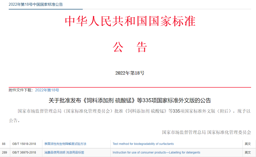 中國(guó)日用化學(xué)研究院制修訂的《手洗餐具用洗滌劑》《衛(wèi)生潔具清洗劑》等11項(xiàng)國(guó)家標(biāo)準(zhǔn)及《表面活性劑生物降解度試驗(yàn)方法》《消費(fèi)品使用說(shuō)明 洗滌用品標(biāo)簽》2項(xiàng)國(guó)家標(biāo)準(zhǔn)外文版獲批發(fā)布。