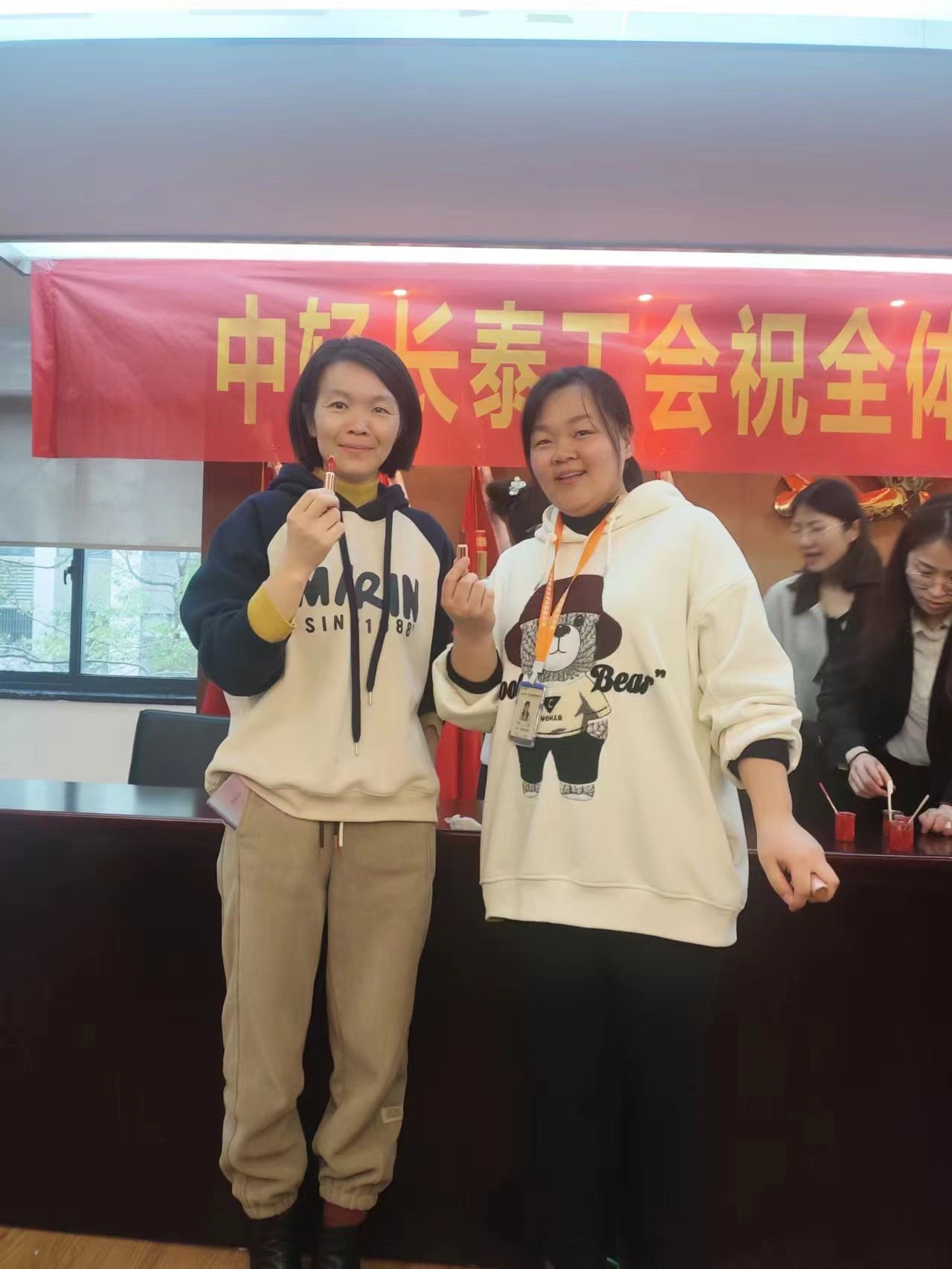 中輕長泰全體女職工們參加一場手工DIY專屬口紅制作活動。女職工們按步驟動手操作,一支支色彩靚麗、造型精致的口紅新鮮出爐。對著鏡子將自己的作品擦在唇上,女職工們喜悅之情洋溢在臉上。