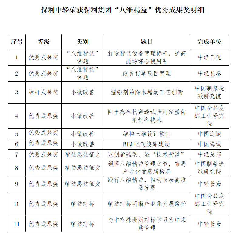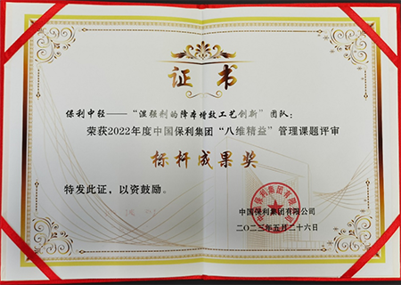 會(huì)議期間,舉行了“八維精益”優(yōu)秀成果頒獎(jiǎng)典禮。保利集團(tuán)從2022年“八維精益”各項(xiàng)工作成果中評(píng)選出83項(xiàng)優(yōu)秀成果獎(jiǎng),其中標(biāo)桿成果獎(jiǎng)6項(xiàng)。保利中輕榮獲標(biāo)桿成果獎(jiǎng)1項(xiàng)、優(yōu)秀成果獎(jiǎng)10項(xiàng),其中,“濕強(qiáng)劑的降本增效工藝創(chuàng)新”課題獲得標(biāo)桿成果獎(jiǎng)。該課題團(tuán)隊(duì)通過(guò)不斷優(yōu)化濕強(qiáng)劑生產(chǎn)技術(shù)方案,成功研制出低成本高質(zhì)量生產(chǎn)技術(shù),提升了產(chǎn)品市場(chǎng)份額和競(jìng)爭(zhēng)力,實(shí)現(xiàn)客戶(hù)成本降低15%。