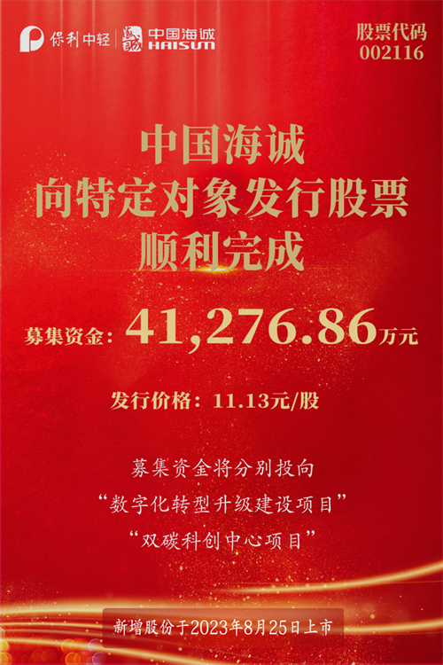2023年8月8日,保利中輕所屬中國海誠成功向特定對象發(fā)行股票并完成資金募集,新增股份于8月25日上市。