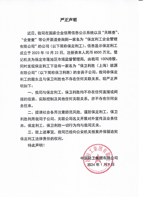 近日,我司在國(guó)家企業(yè)信用信息公示系統(tǒng)以及“天眼查”、“企查查”等公開(kāi)渠道查詢到一家名為“保定利工企業(yè)管理有限公司”的公司(以下簡(jiǎn)稱保定利工)。信息顯示保定利工成立于2023年10月23日,注冊(cè)資本人民幣8500萬(wàn)元,登記機(jī)關(guān)為保定市蓮池區(qū)市場(chǎng)監(jiān)督管理局,由我司100%持股。同時(shí)發(fā)現(xiàn)保定利工下設(shè)有一家名為“保衛(wèi)利勝(上海)能源有限公司”(以下簡(jiǎn)稱保衛(wèi)利勝)的全資子公司。我司非保定利工的股東且與保衛(wèi)利勝也不存在任何關(guān)聯(lián)關(guān)系,現(xiàn)嚴(yán)正聲明如下: