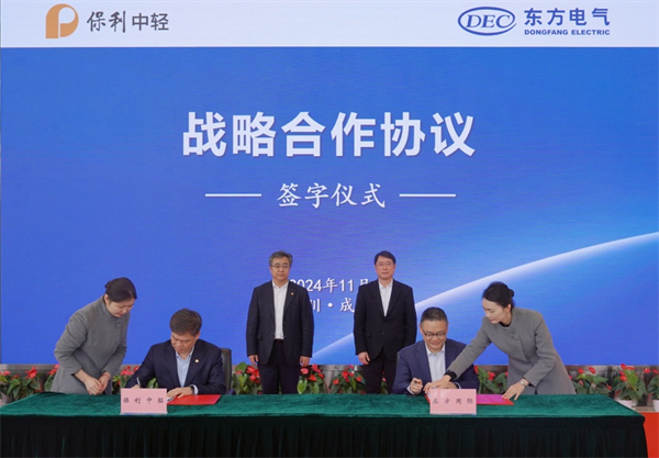 11月19日,保利中輕與東方電氣集團(tuán)國(guó)際合作有限公司(簡(jiǎn)稱“東方國(guó)際”)在蓉簽署戰(zhàn)略合作協(xié)議。保利集團(tuán)總經(jīng)理助理,保利中輕黨委書記、董事長(zhǎng)安勝杰;東方電氣股份有限公司副總裁,東方國(guó)際黨委書記、董事長(zhǎng)李建華出席儀式見(jiàn)證簽約。