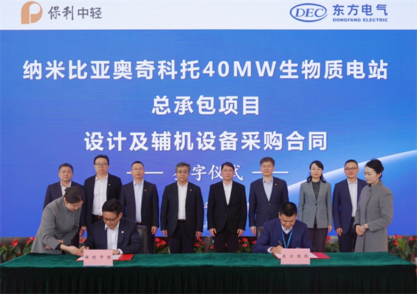 保利中輕副總經(jīng)理、中國(guó)海誠(chéng)董事長(zhǎng)趙國(guó)昂與東方國(guó)際副總經(jīng)理周杰代表雙方簽署戰(zhàn)略合作協(xié)議。中國(guó)海誠(chéng)副總裁羅軍與東方國(guó)際機(jī)電事業(yè)部總經(jīng)理杜曉東代表雙方簽署納米比亞奧奇科托40MW生物質(zhì)電站總承包項(xiàng)目設(shè)計(jì)及輔機(jī)設(shè)備采購(gòu)合同。簽約儀式前,雙方就深化合作深入友好交流。