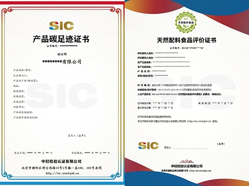 中輕檢驗頒發(fā)的《產(chǎn)品碳足跡證書》《天然配料食品評價證書》