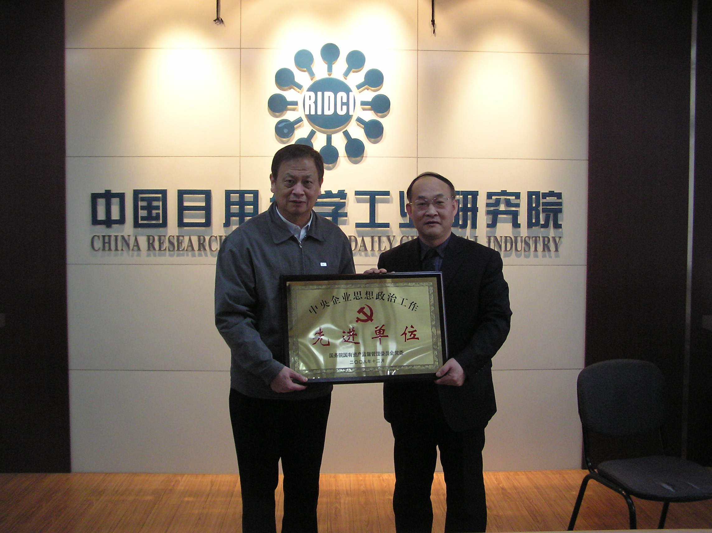 2009年,中國(guó)日用化學(xué)工業(yè)研究院榮獲國(guó)務(wù)院國(guó)資委委表彰的中央企業(yè)思想政治工作先進(jìn)單位。2010年2月24日,集團(tuán)公司黨委副書記、紀(jì)委書記梁江東同志到中國(guó)日用化學(xué)工業(yè)研究院開展工作,代表集團(tuán)公司黨委給中國(guó)日用化學(xué)工業(yè)研究院頒發(fā)了中央企業(yè)思想政治工作先進(jìn)單位獎(jiǎng)牌。