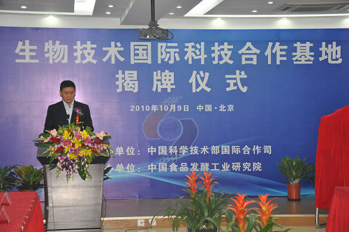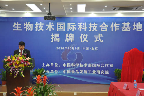 揭牌儀式上,靳曉明司長和陳鄂生董事長分別致辭。靳司長指出,科技的靈魂在于開放,食品行業(yè)作為國民經(jīng)濟的重要支柱產(chǎn)業(yè),技術(shù)的進步離不開國際合作。希望以設(shè)立生物技術(shù)“國際科技合作基地”為契機,積極參加國際科技合作交流活動,充分利用國際資源,進一步挖掘潛力,引進高級人才,使基地真正成為“技術(shù)領(lǐng)先、人才聚集”的國際科技創(chuàng)新中心。陳董事長要求,食品發(fā)酵院要深刻領(lǐng)會科技部《“十一五”國際合作規(guī)劃綱要》精神,緊密圍繞建設(shè)創(chuàng)新型國家的總體目標,切實提高自主創(chuàng)新能力,建設(shè)“項目基地人才”一體化的國際科技研發(fā)高地。蔡院長代表基地建設(shè)單位發(fā)表講話。