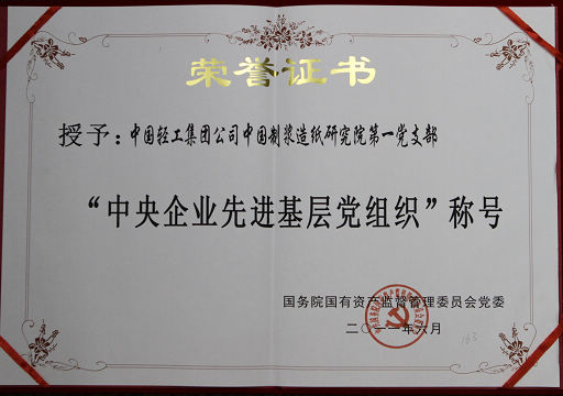 中國輕工集團(tuán)公司中國制漿造紙研究院第一黨支部七一前夕榮獲國資委“中央企業(yè)先進(jìn)基層黨組織”榮譽(yù)稱號。