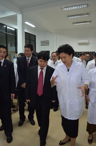 揭牌儀式后,陳鄂生董事長陪同劉延東國務委員與梅森安副首相參觀了建設中實驗室。劉延東詳細地詢問了設備功能,要求嚴格控制援助設備的質量,詳細論證援助方案,使援助項目切實滿足柬方實際需求。陳董事長感謝劉延東國務委員對中輕集團的關心和支持,表示一定落實指示精神,建設好援助項目。