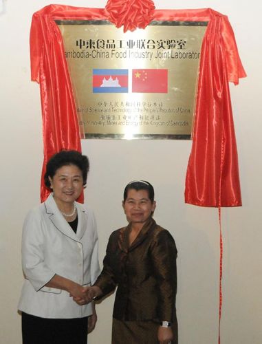 2012年12月7日,國務委員劉延東與柬埔寨王國副首相梅森安在柬埔寨首都金邊共同為“中柬食品工業(yè)聯(lián)合實驗室”揭牌。教育部部長袁貴仁、科技部黨組書記王志剛、國務院副秘書長江小涓、外交部副部長宋濤及柬埔寨國務委員會、工業(yè)礦產及能源部、教育部、外交部等部門高級官員出席揭牌儀式。集團公司陳鄂生董事長出席儀式并陪同兩國領導人參觀了實驗室。集團公司所屬中國食品發(fā)酵工業(yè)研究院院長蔡木易、中國海誠股份南寧公司董事長王毅軍等中柬雙方項目執(zhí)行人員參加了典禮。